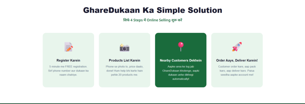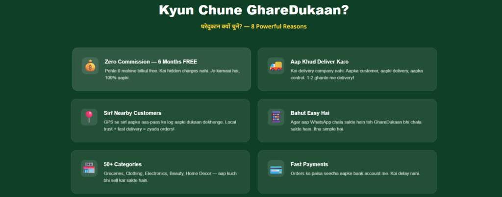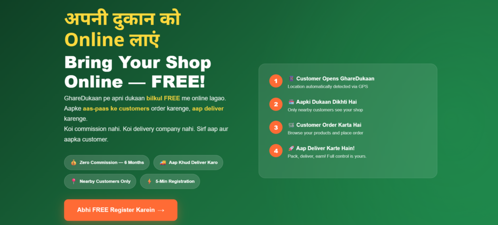 - GhareDukaan: Local customers ke liye — fast delivery, zero commission, daily orders